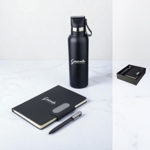 Le coffret de bureau contient une gourde isotherme, un carnet et un stylo. Ce sont 3 objets indispensables au travail. Cet objet est compatible avec tous les univers de marque . Son point fort : il est tout prêt, tout inclus, avec une boîte cadeau et trois produits qui sont des standards de cadeau pro. Un coffret conçu pour faire plaisir tout en vous faisant gagner du temps.
