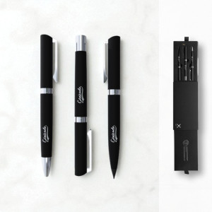 La parure comprend 3 stylos : un stylo bille, un roller et une crayon graphite. Les recharges sont incluses, idéal pour être présent durablement auprès de vos cibles. Sa boîte, avec son système d’ouverture bluffant, garantit un effet wahou après de vos clients ! Et elle est aussi personnalisable.